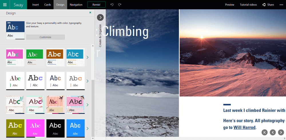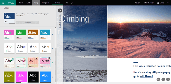 Το Sway είνα άψογα ενσωματωμένο με το OneDrive, τις συσκευές σας, τα κοινωνικά σας δίκτυα και με το διαδίκτυο έτσι ώστε να μπορείτε να μεταφέρετε το περιεχόμενό σας κατευθείαν στον καμβά σας. Η ενσωματωμένη μηχανή σχεδίασης μηδενίζει την ταλαιπωρία της μορφοποίησης διαφόρων κομματιών του περιεχομένου εντάσσοντας τα σε μία συνεκτική διάταξη. Με αυτόν τον τρόπο μπορείτε ευκολότερα να διαμορφώσετε τη σχεδίαση για να δημιουργήσετε μία εμφάνιση και μια αίσθηση που αντανακλά το μοναδικό σας στυλ.